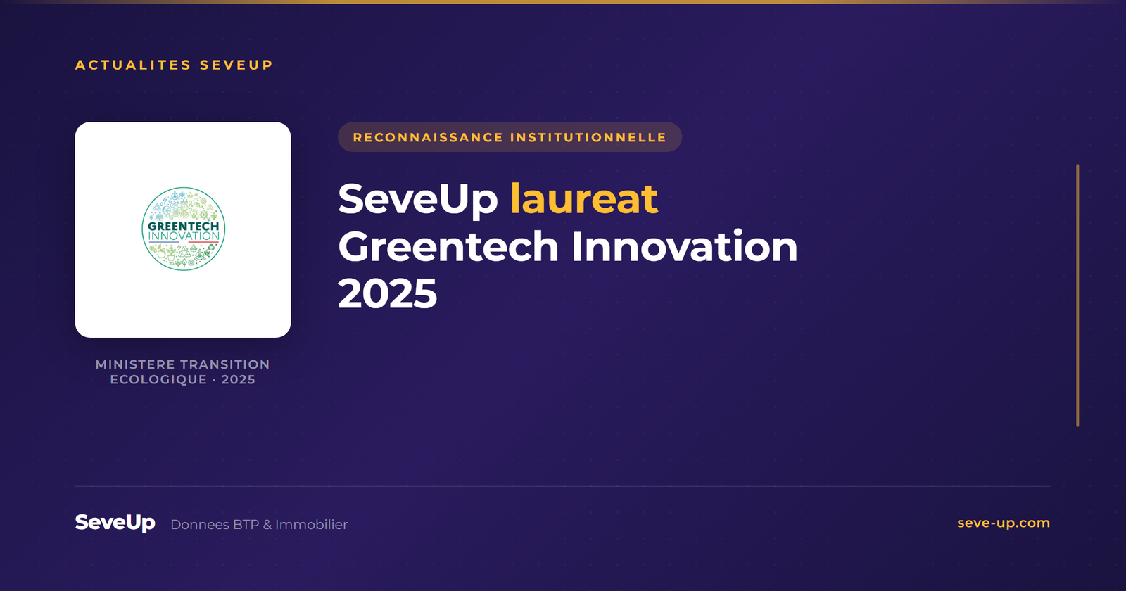 Le 12 juin 2025, à l'occasion de Vivatech, le Ministère de la Transition écologique a dévoilé les lauréats de la promotion Greentech Innovation 2025. SeveUp fait partie des entreprises distinguées, dans la catégorie Bâtiment et ville durables.
